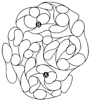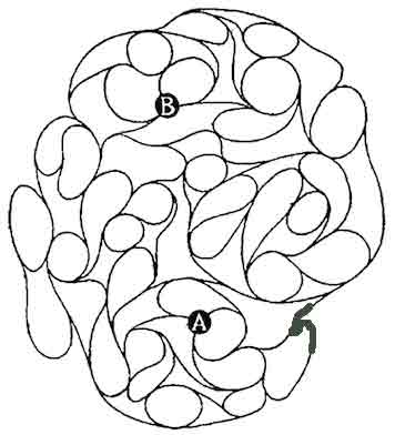El tren debe ir desde la estacion A  a la B. En cada interseccion de vias el tren solo puede cambiar de vias hacia delante ,  es decir , no podría hacer  giros como el marcado en la imagen de abajo en trazo grueso.