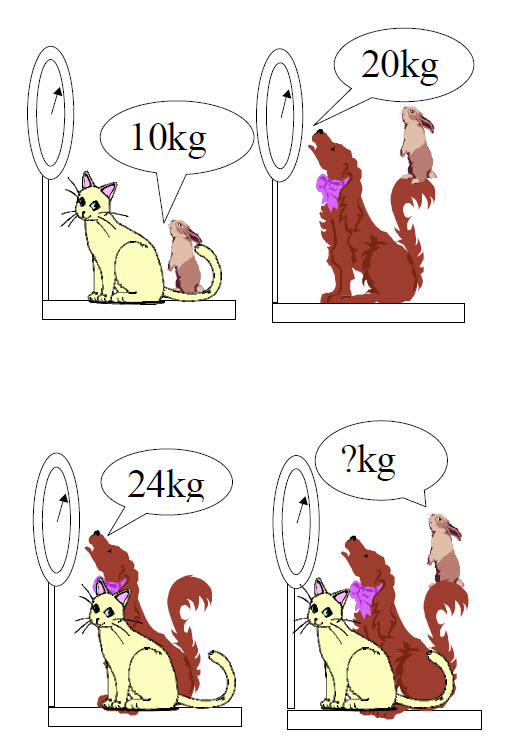 [spoiler] 10 + 20 + 24 = 2 perros + 2 gatos + 2 conejos. Dividiendo por 2, 5 + 10 + 12 = perro + gato + conejo. O sea, ?kg = 27kg[/spoiler]