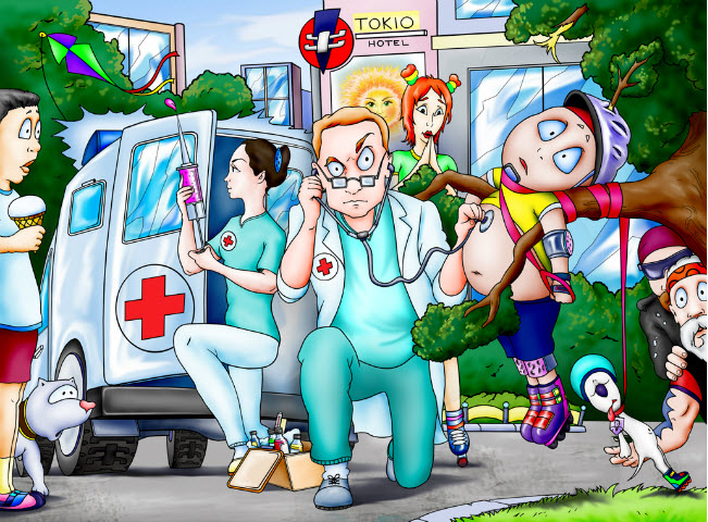 El logo del hotel con el dibujo de las llantas de la ambulancia.