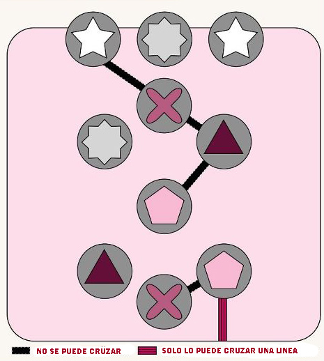 Dibuja lineas para unir los simbolos iguales ( pentágono con pentágono , etc…) , sin salirse de la zona interior , sin que se crucen las lineas y respetando las indicaciones sobre las lineas negras y rayada del dibujo.