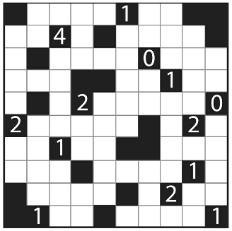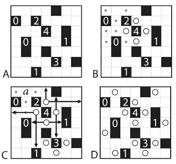 En el ejemplo, la cuadrícula vacía es A. Como cada número indica cuántas bombillas hay junto a él vertical y horizontalmente, sabemos que hay bombillas en todas las posiciones horizontales y verticales junto al 4, y también que no hay bombillas en las posiciones horizontales y verticales junto a ambos 0, que he marcado con puntos en la imagen B. Como dos de las bombillas adyacentes al 4 también lo son al 2, sabemos que los otros lados del 2 no pueden tener ninguna bombilla, por lo que he añadido un punto extra en el cuadrado sobre el 2. En la imagen C, las flechas muestran las filas y columnas iluminadas por las cuatro bombillas colocadas en la imagen anterior. El cuadrado sobre el 3 no puede tener una bombilla porque está en la trayectoria de otra bombilla, por lo que los otros tres lados del 3 deben tener una cada uno. También podemos deducir que tiene que haber una bombilla en a, ya que todas las demás posiciones que iluminarían ese cuadrado tienen prohibido tener bombillas, ya sea porque las hemos marcado como sin bombilla o porque están en la trayectoria de luz de otra bombilla. El rompecabezas completo se muestra en D.