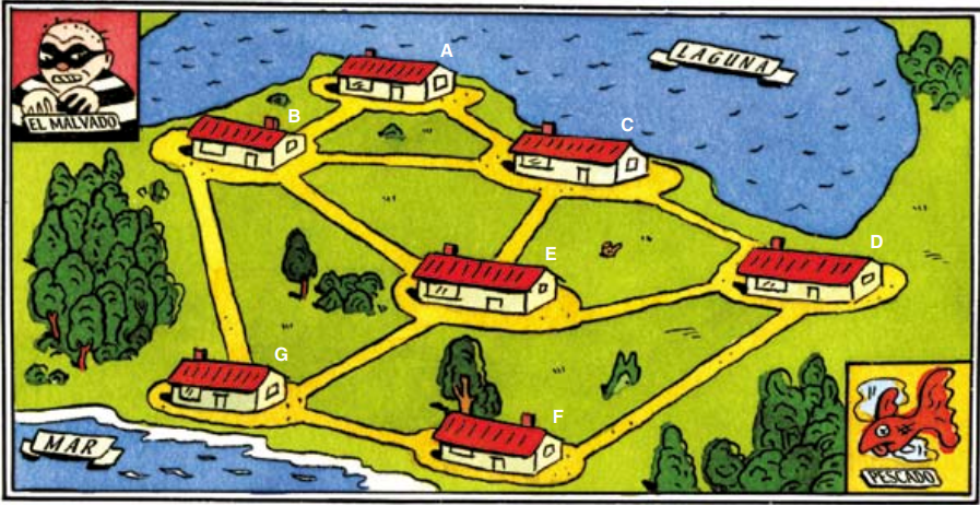 Parecía mentira que en un paraje tan encantador pudiera ocurrir un delito tan absurdo y repulsivo. Siete casitas rústicas, cuatro de ellas al borde de una laguna (de A a D), dos frente al mar (F y G) y una en medio de las demás (E), estaban conectadas por senderos, como se indica en el mapa. Un pescador vio a un individuo de mala catadura, portador de un gran cesto, acercarse a la urbanización desde la laguna y deslizarse en el interior de una de las casitas situadas al borde de esa masa de agua. El hombre fue después recorriendo los senderos que iban de una casita a otra, dejando por el camino pescado podrido.