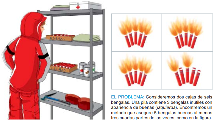 Supongamos que tienes que partir hacia el Ártico. ¿Sabrás hallar un método para seleccionar cinco bengalas de modo que la probabilidad de que todas estén en buen estado sea de por lo menos 3/4? ¿Cómo quedaría modificada esa probabilidad si la caja mala contuviera, en lugar de 3, cuatro bengalas inservibles?