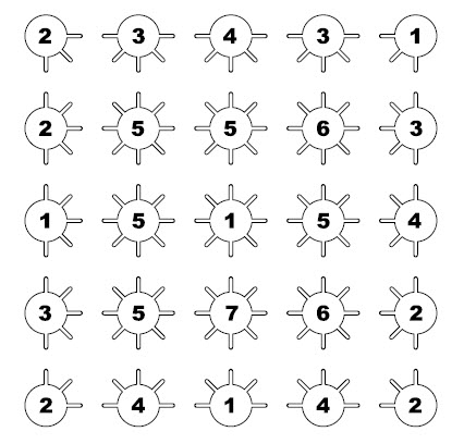 Arriba tenemos una serie de circulos , en cuyo interior el número indica las lineas que le conectan con círculos adyacentes.