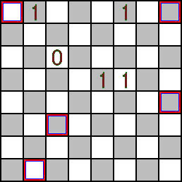 Las casillas con cuadro rojo son las posibles localizaciones para 5 piezas de ajedrez : Rey , Dama , Torre , Alfil y Caballo