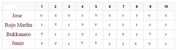 Jose, Rojo Merlin, bukkanero y Junio respondieron a las preguntas de la manera que muestra la tabla de arriba.