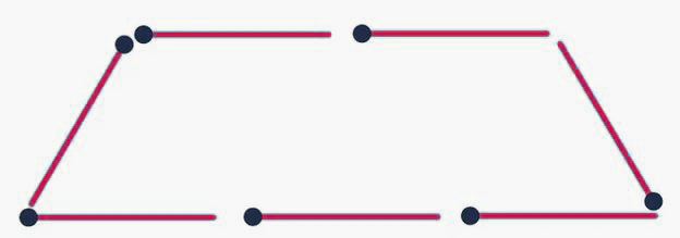 De trapecio a triángulos El trapecio de arriba está compuesto por 7 cerillas. Mueve las posiciones de 3 cerillas para obtener 2 triángulos equiláteros. (El resultado final debe usar todas las cerillas y no tener líneas extrañas).