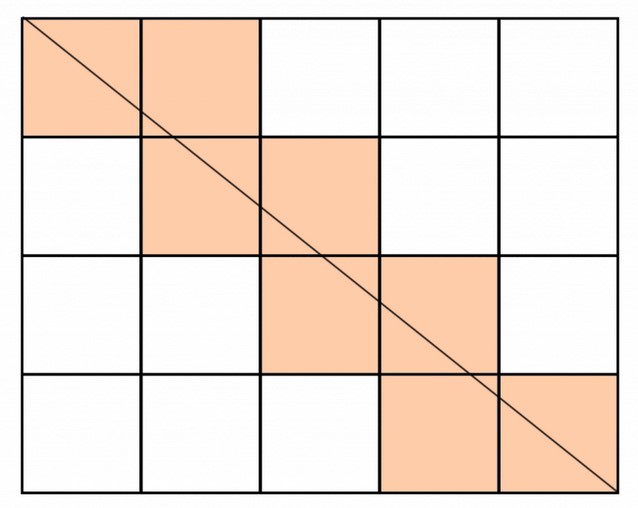 Diagonal Un rectángulo de 1000 × 1004 se divide en cuadrados de 1 × 1. ¿Por cuántos de estos cuadrados pasa la diagonal principal del rectángulo grande? Vale como ejemplo de un caso de 5 x 4 la imagen de arriba cuya solución sería 8.