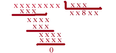 [spoiler]Se ve que los dos digitos al lado del 8 del resultado deben ser 0, además el ultimo tiene que ser solo 9 porque da una cifra de 4 digitos y el 8 solo consigue 3, el primero debe ser tambien 8 porque al multiplicarlo por el divisor se obtiene una de 3 y no de 4, y no puede ser menos porque hasta el 1000 daría un resto de mas de 2 cifras. o sea el resultado es 80809. El divisor tiene que ser 12X para que multiplicado por 9 de 4 cifras y por 8 tres, cercana al 1000.Si es menos de 124 el dividendo no tiene 8 cifras, si es mas de 124 no se consigue la continuidad. por lo tanto el unico posible es 10.020.316/124= 80809 [/spoiler]
