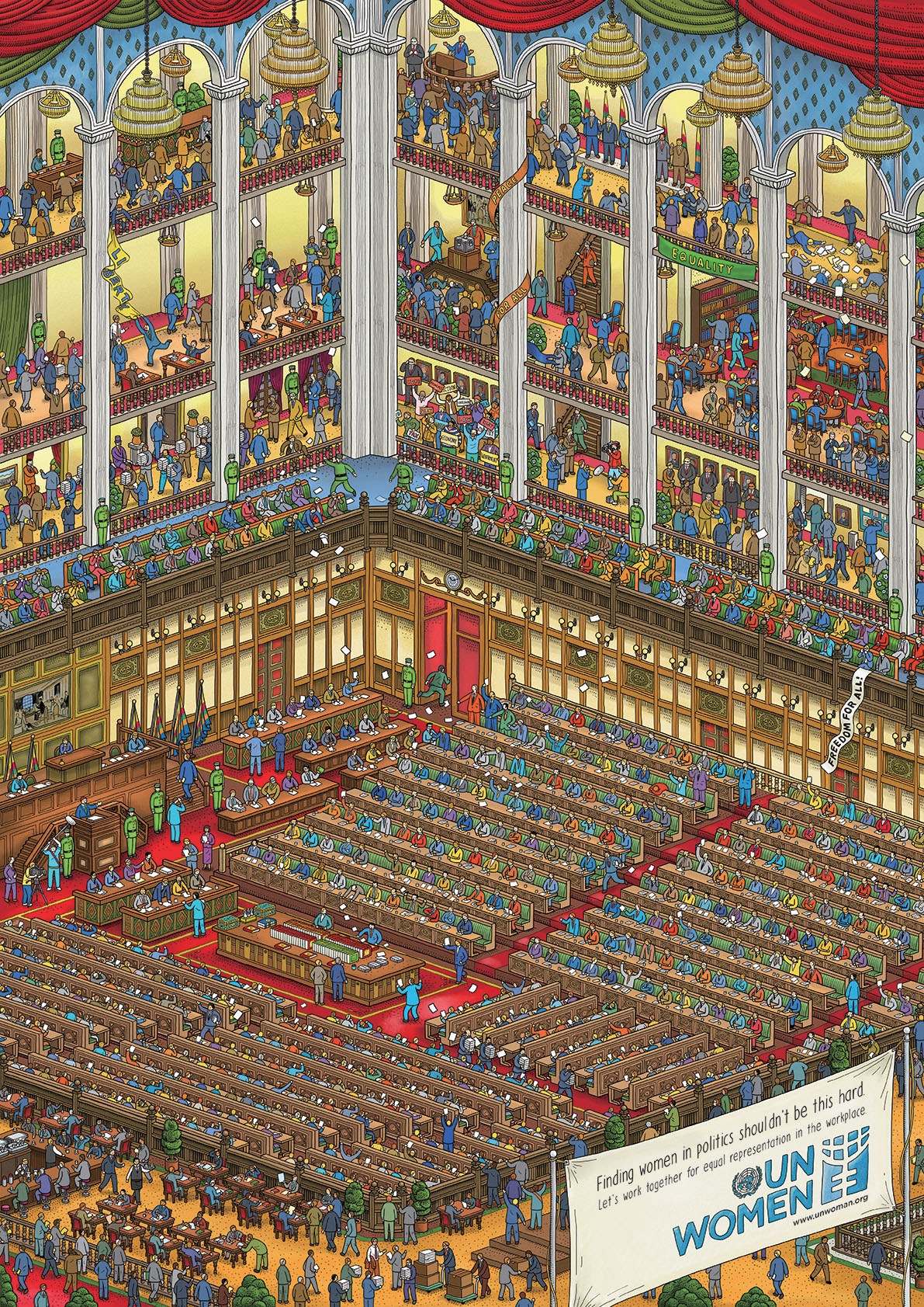La idea, inspirada en el popular “Buscando a Wally”,lanza el mensaje “Encontrar una mujer en ciencia/política/tecnología no debería ser tan difícil.”