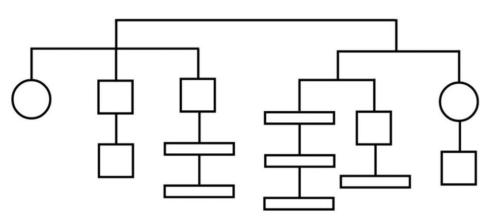 Equilibrio. El total de todos los pesos suman 24 kg . A formas iguales corresponden pesos iguales. Todos los brazos del balancín están en equilibrio. ¿Cuánto vale cada peso?