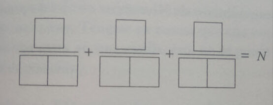 Coloque los dígitos del 1 al 9 en las nueve casillas vacías de esta expresión de tal forma que la suma de las tres fracciones sea un número entero, N, de una cifra, un solo dígito. Dos casillas juntas representan un número de dos dígitos, 89 por ejemplo, no su producto.