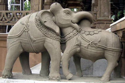Ilusión óptica. Elefante y buey luchando. En ambas esculturas vemos un elefante y un buey ( o toro) donde se mezclan las cabezas a modo de ilusion formando solo una.