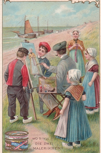 si se le da vuelta a la imagen se ve en la paleta de colores una mujer pintando.