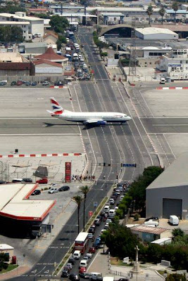 la primera es real, ya que en Gibraltar ay un aeropuerto que cruza la autopista, por eso, cada vez que va a aterrizar algun avion, cierran la autopista momentaniamente para que no haya ningun accidente. Mas info aqui http://www.planetacurioso.com/2009/07/13/el-curioso-aeropuerto-de-gibraltar/