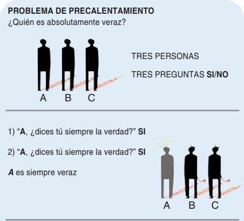 En una sala hay cinco personas. Una de ellas es absolutamente veraz, y dirá siempre la verdad en todo cuanto se le pregunte. Las otras cuatro son mentirosas alternantes, es decir, cada una de ellas va por turno diciendo la verdad, mintiendo, diciendo la verdad… Por mala suerte, no sabemos si los mentirosos alternantes van a empezar diciendo la verdad o mintiendo. Peor todavía, un mentiroso alternante puede no decidir si en la primera pregunta que se le haga va a decir la verdad o a mentir hasta después de haberla oído. Ahora bien, tras la primera pregunta, tiene que ir alternando verdades y mentiras. Por otra parte, se sabe que todos los presentes conocen quién es absolutamente veraz. Ninguna de las personas parece de fiar. Tenemos, sin embargo, que determinar quién es absolutamente veraz. Sólo podemos hacer dos preguntas, pero no es obligado que la respuesta haya de ser un mero “sí” o “no”. Hay cinco personas entre las que elegir. Cada pregunta ha estar dirigida a una sola persona (aunque es lícito hacerle las dos preguntas a una misma) y la respuesta habrá de darla solamente la persona interrogada. ¿Te parece que podremos resolverlo? Para “subir nota”: ¿Cuántas preguntas serían necesarias si fueran siete las personas de la sala?