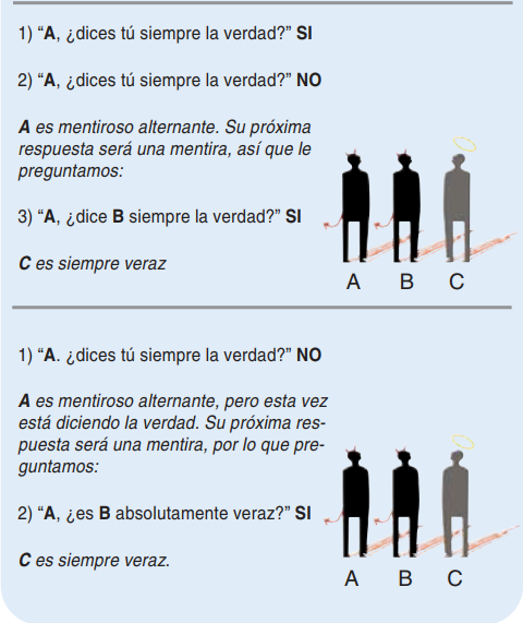 Ahora, si a la pregunta de «¿Cuántos son como tú?» responde «Somos cuatro», entonces sabremos que estamos ante un mentiroso alternante que ha empezado diciendo la verdad. Con lo cual, la siguiente pregunta nos la contestará con una mentira. Por tanto, le podríamos preguntar: «Dime el nombre de uno que sea como tú». Y, como ahora contestará una mentira, dirá el nombre del único veraz.