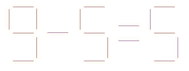 Igual queda un poco chapuzas, pero [spoiler] si al 5 que va tras el signo menos le quitamos el palo de visera y lo colocamos en vertical haría una especie de 4, quedando que 9 – 4 = 5 [/spoiler]
