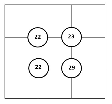 Coloca cada uno de los dígitos del 1 al 9 en un cuadrado diferente de la cuadrícula anterior para que el número en cada círculo sea la suma de los cuatro dígitos que lo rodean directamente.