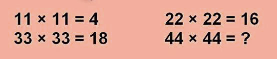 19 [spoiler] 11×11=121 } 1+2+1=4 22×22=484 } 4+8+4=16 33×33=1089 } 1+0+8+9=18 44×44=1936 } 1+9+3+6=19 [/spoiler]